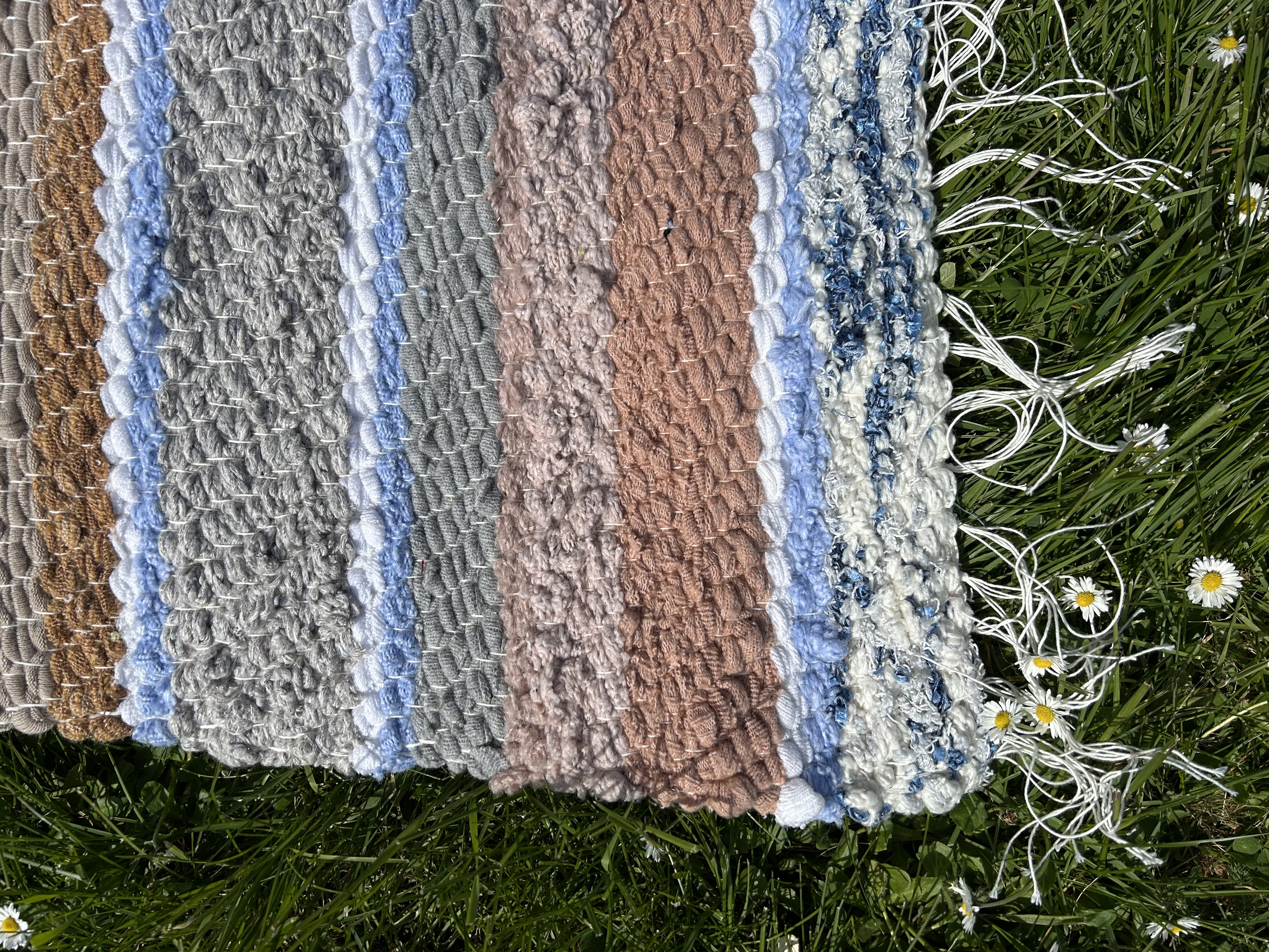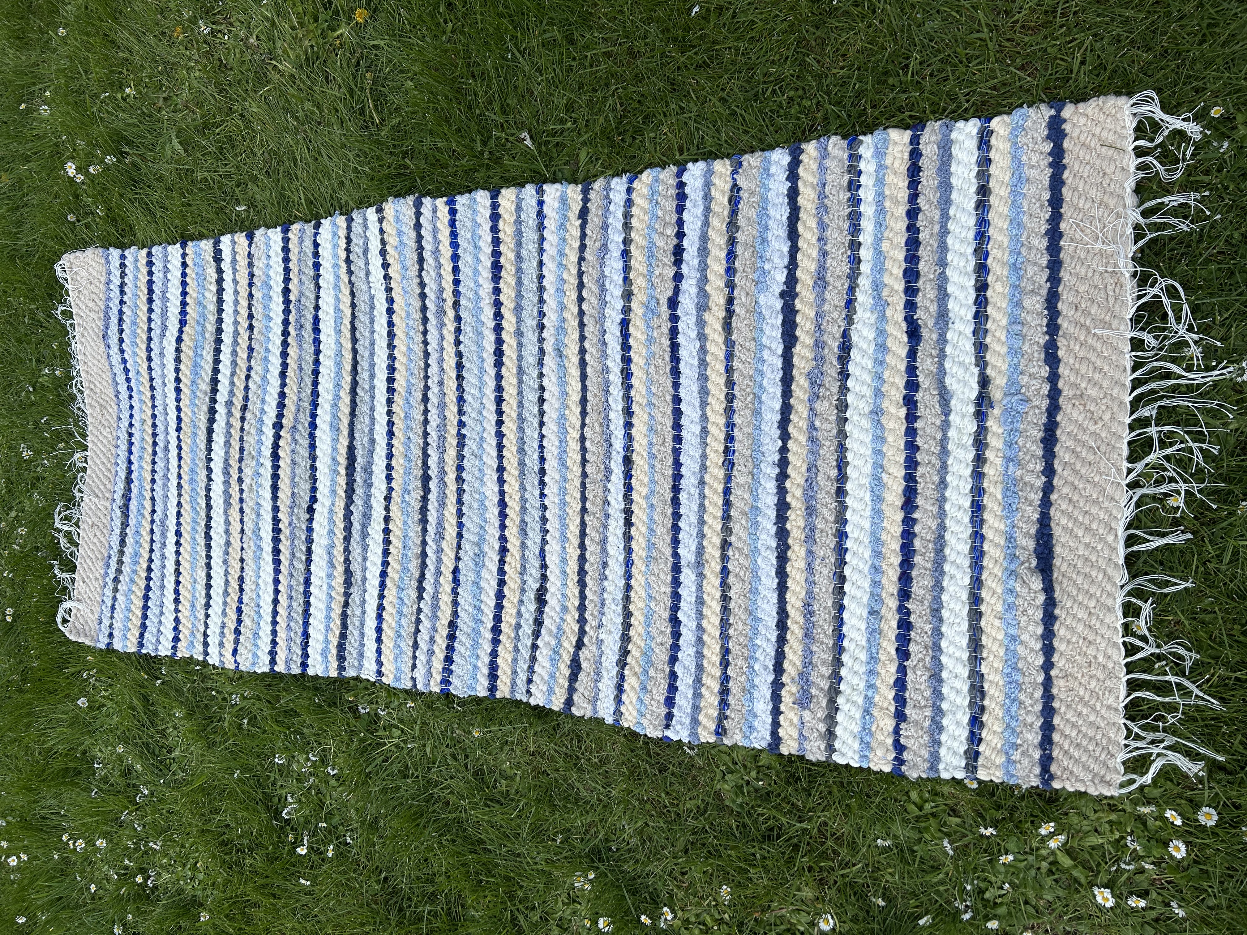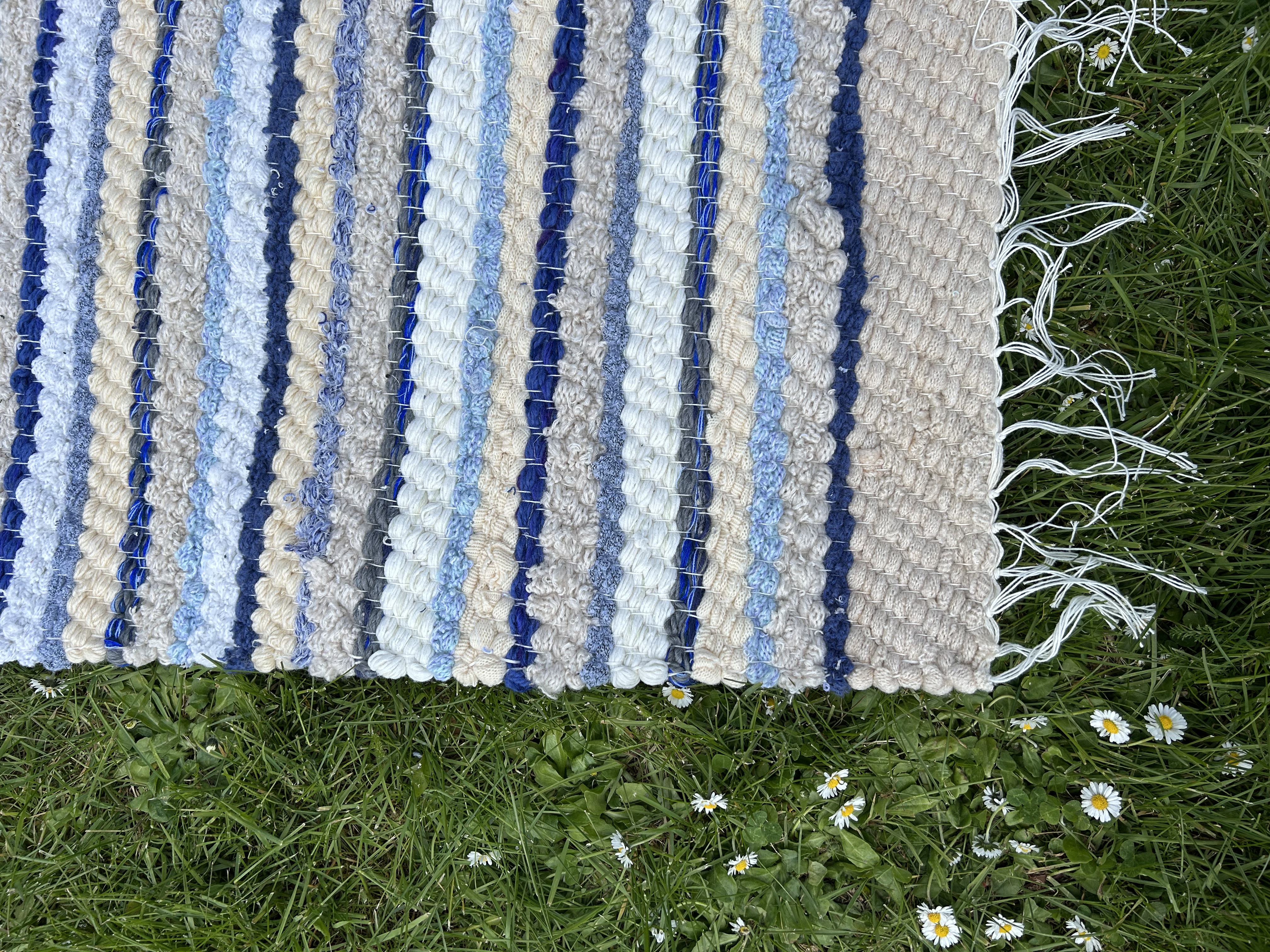 Klassikaline sinivalge kaltsuvaip, millele lisavad soojust beežid triibud. Ajatu ja kodune valik, mis loob puhta ja korras tunde.