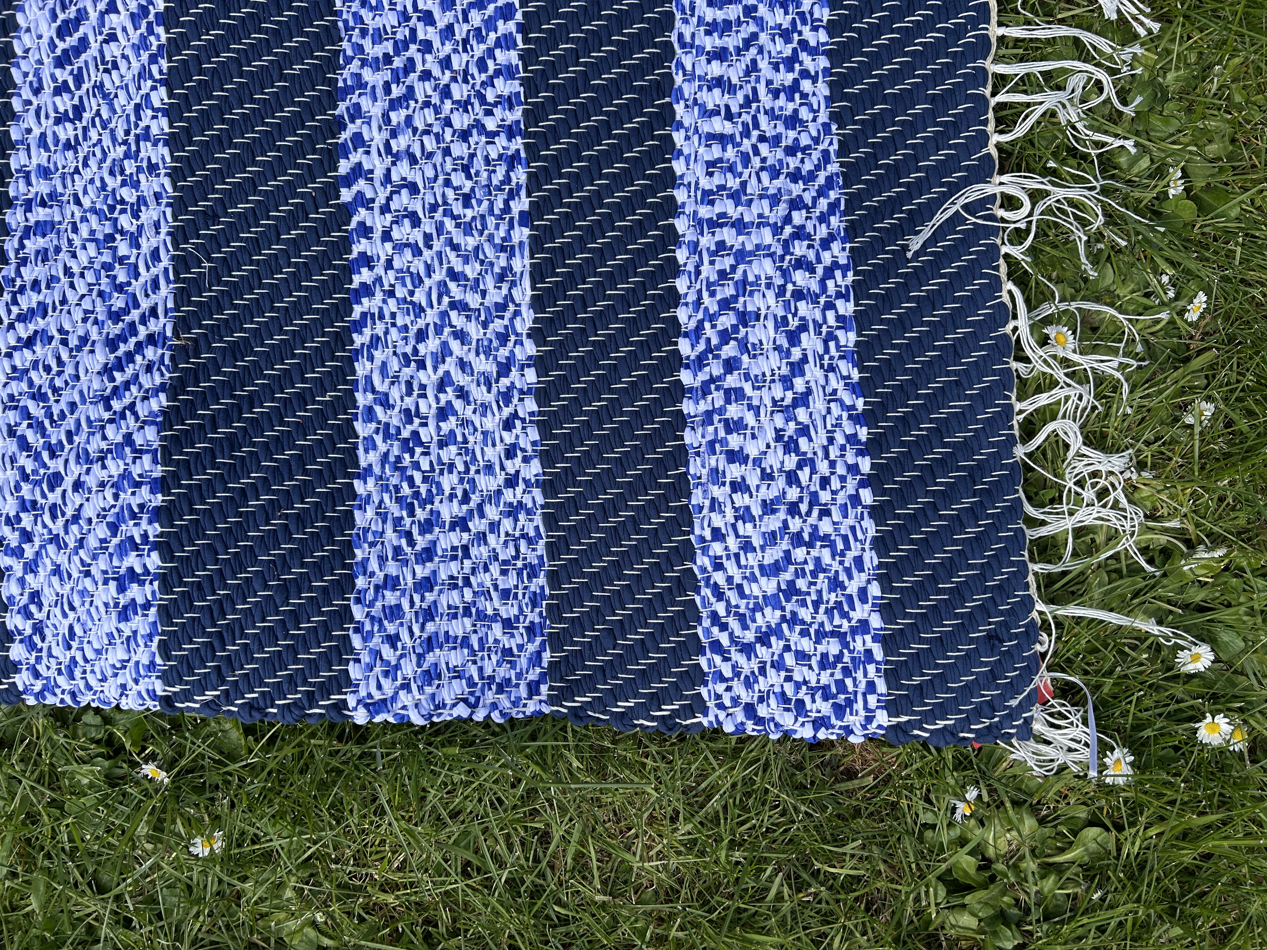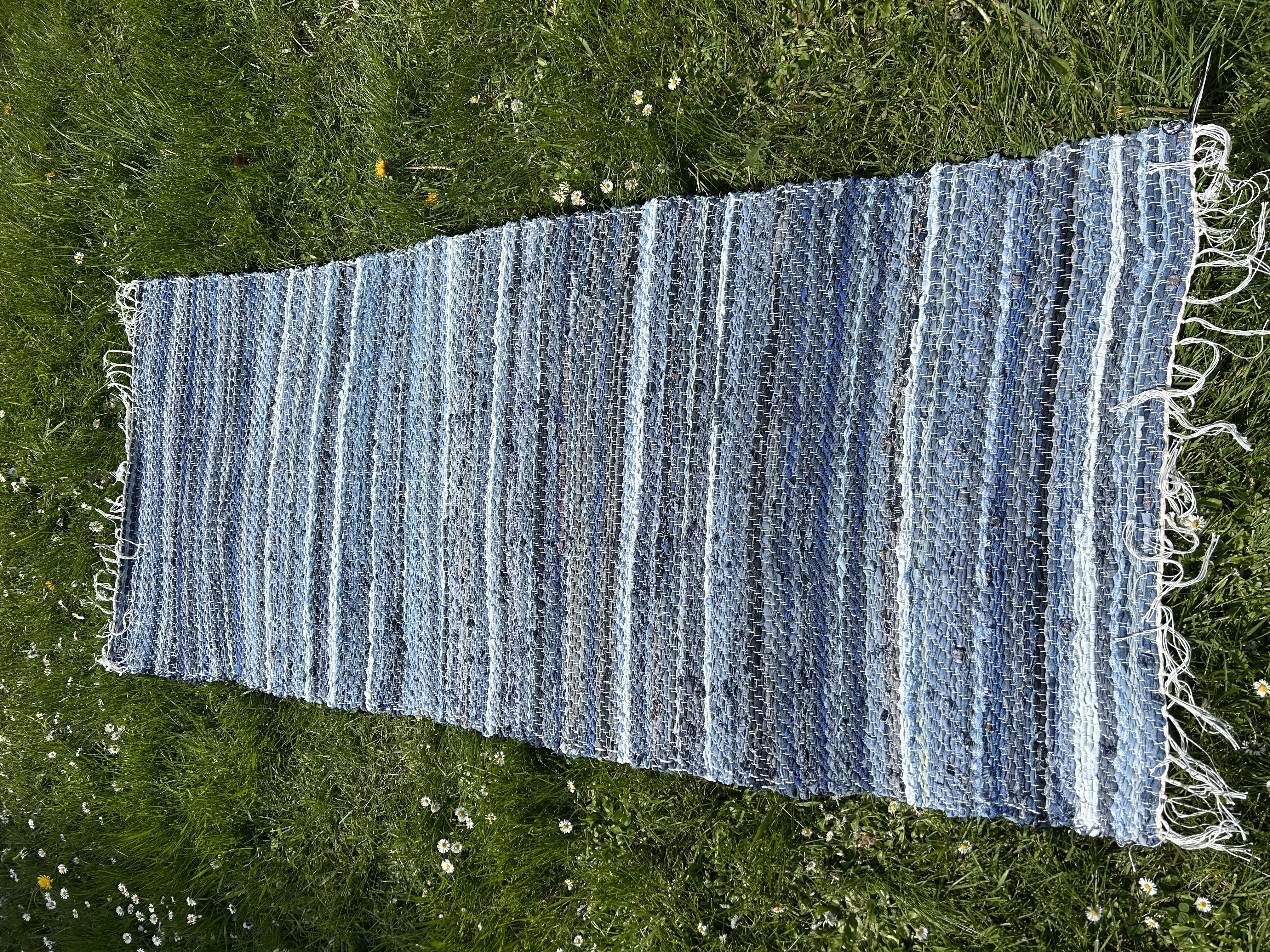 Jõulise kontrastiga kaltsuvaip, kus vahelduvad tumesinine ja mustriline helesinine. Graafiline ja modernne valik, mis loob tugeva visuaalse aktsendi.