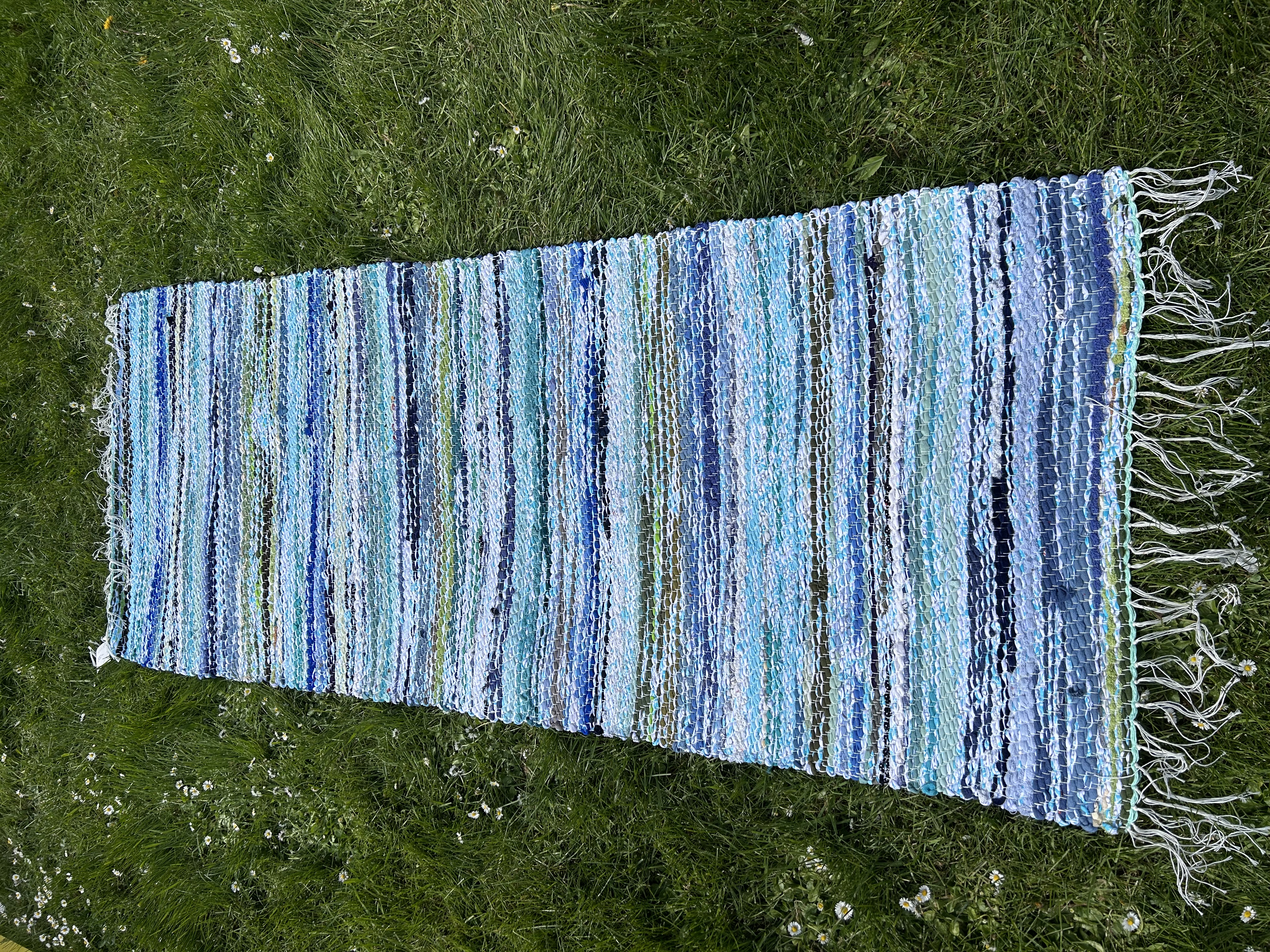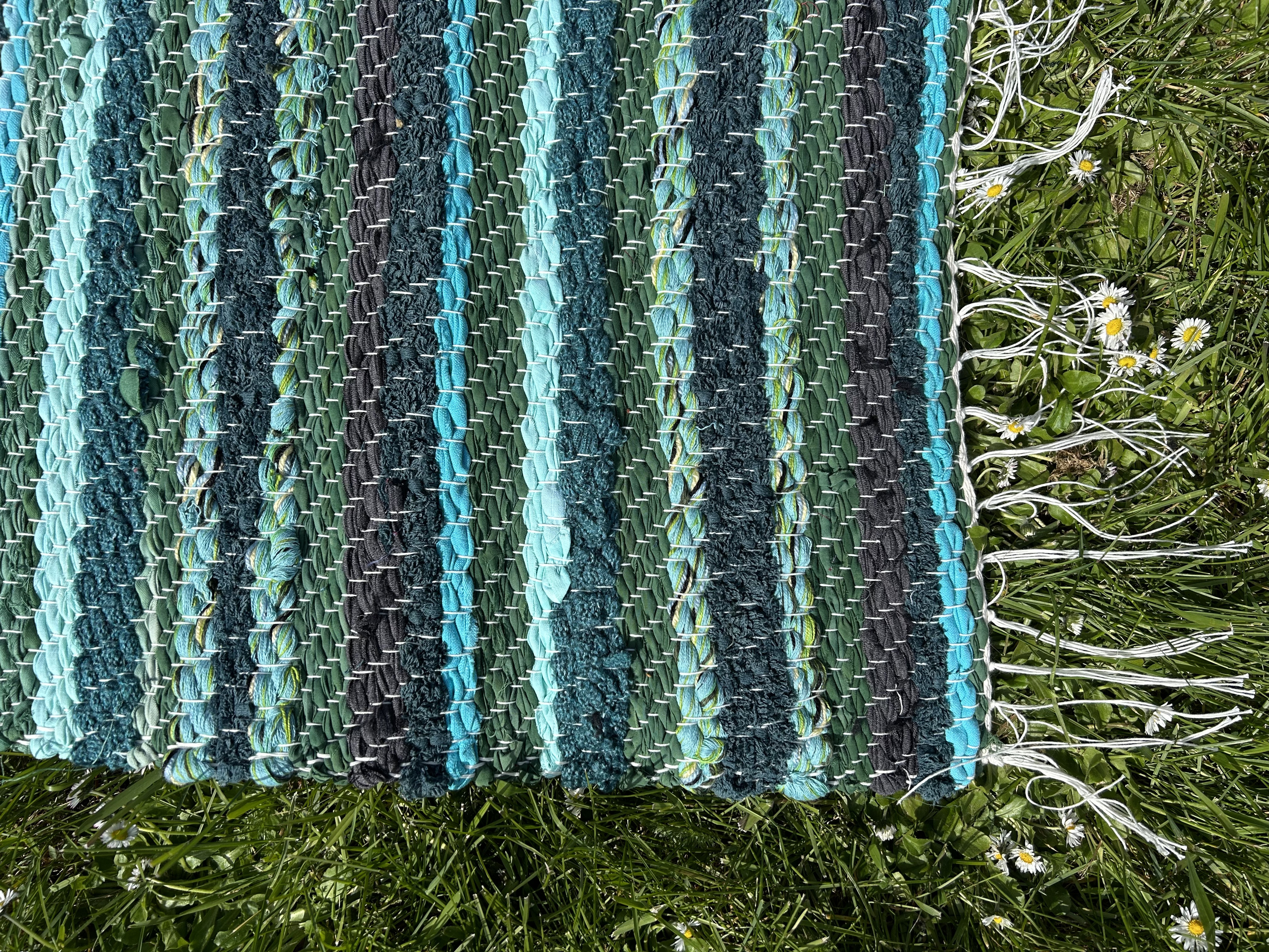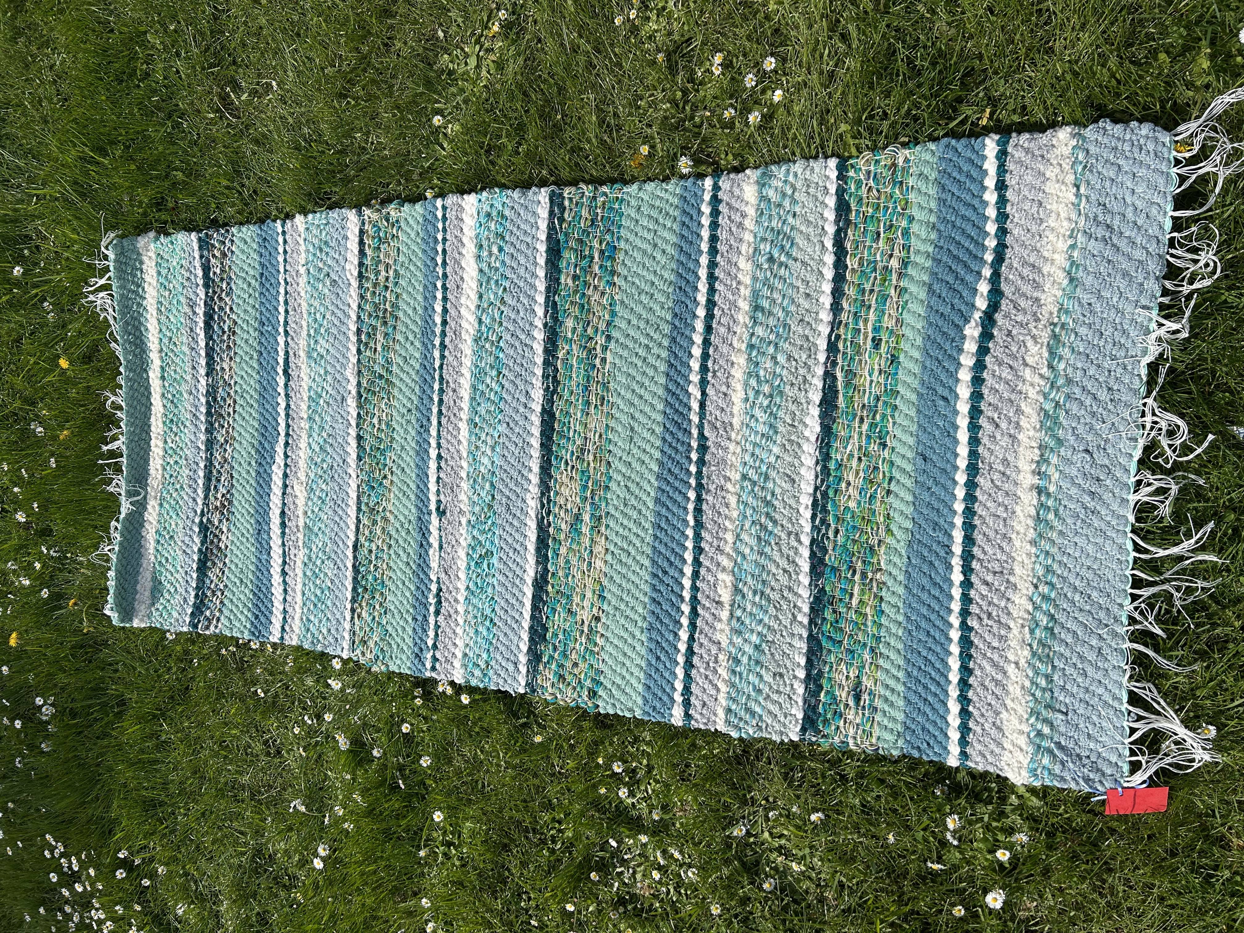 Akvamariini ja türkiissinistes toonides kaltsuvaip, mis meenutab suvist merevett. Värske ja rahustav, ideaalne vannituppa või magamistuppa.