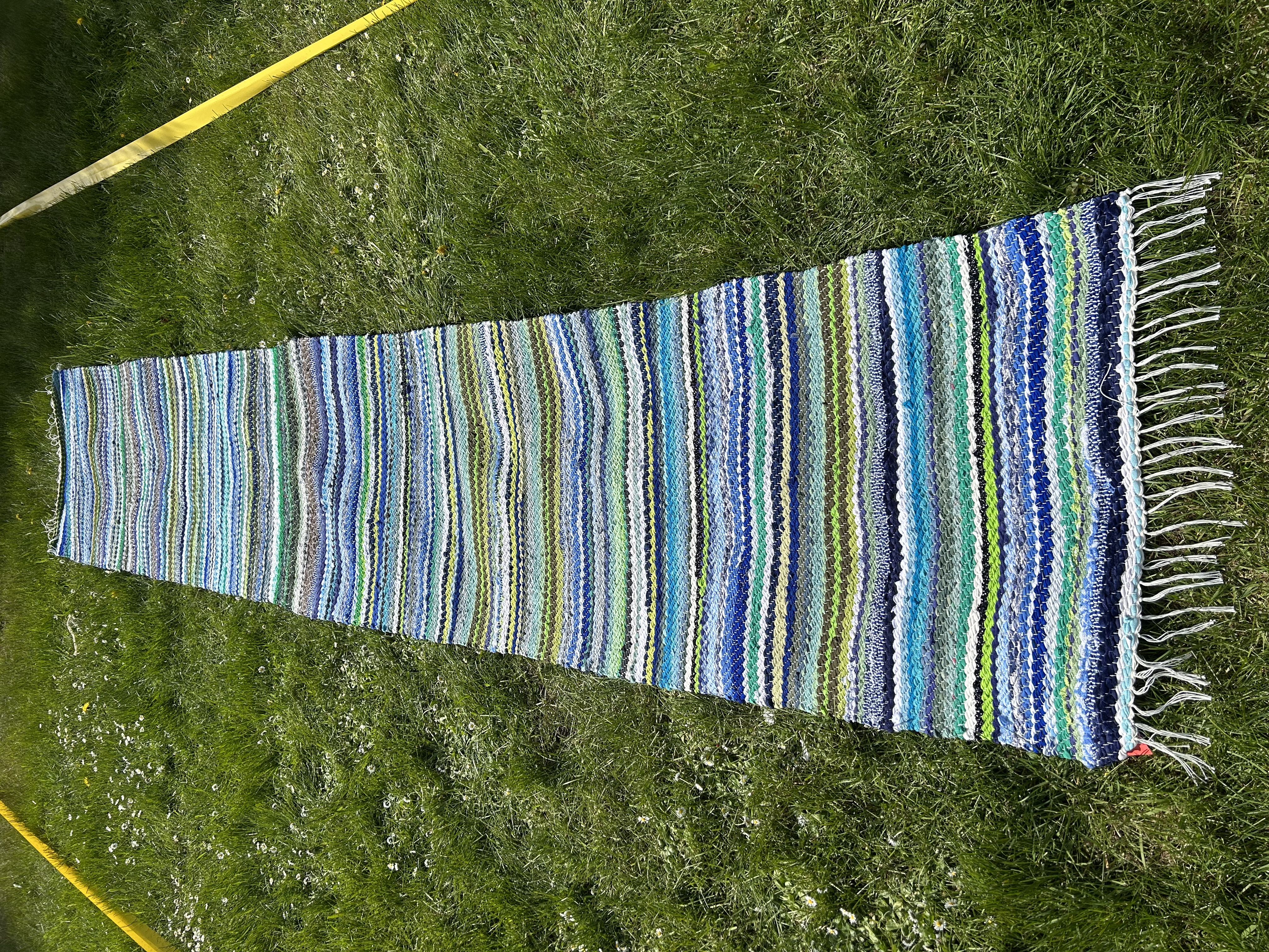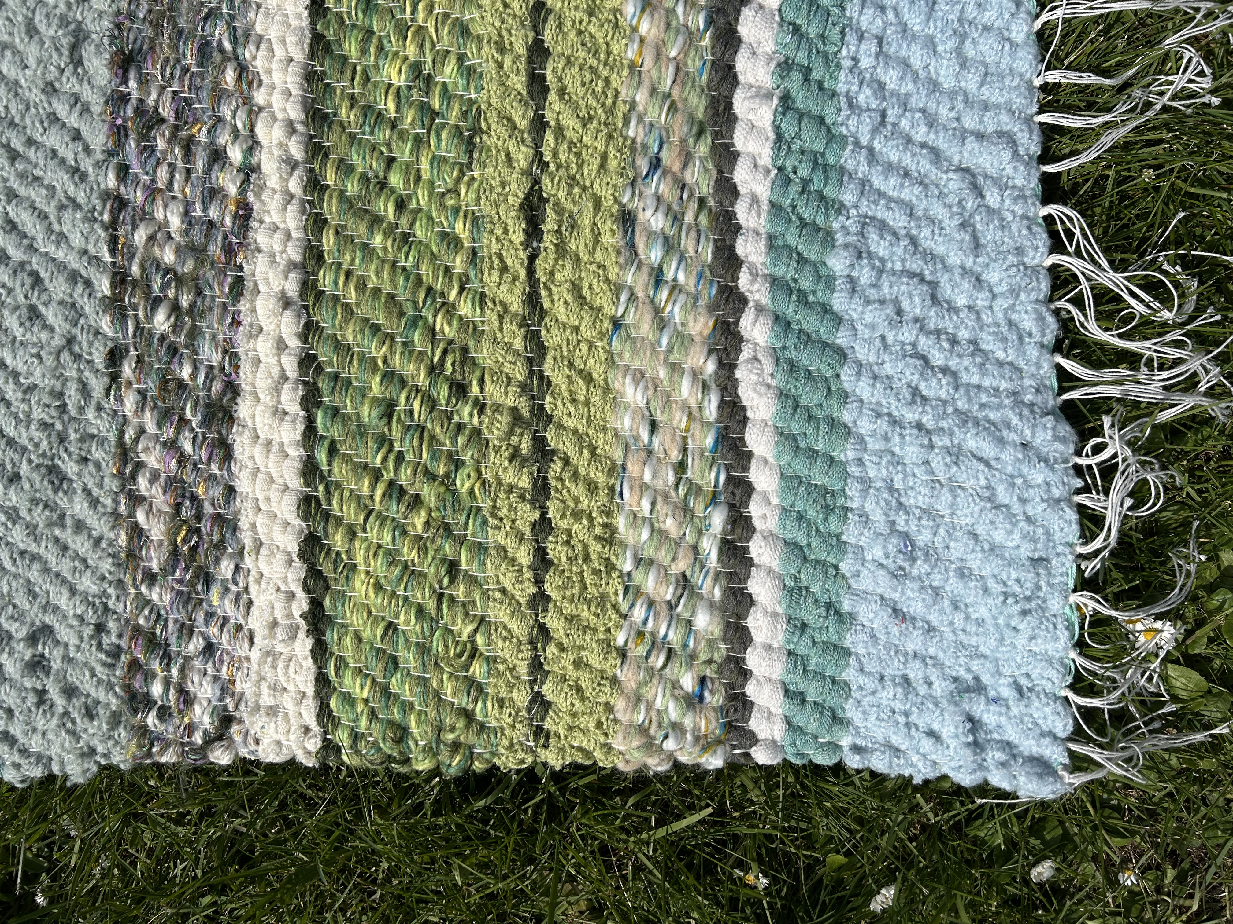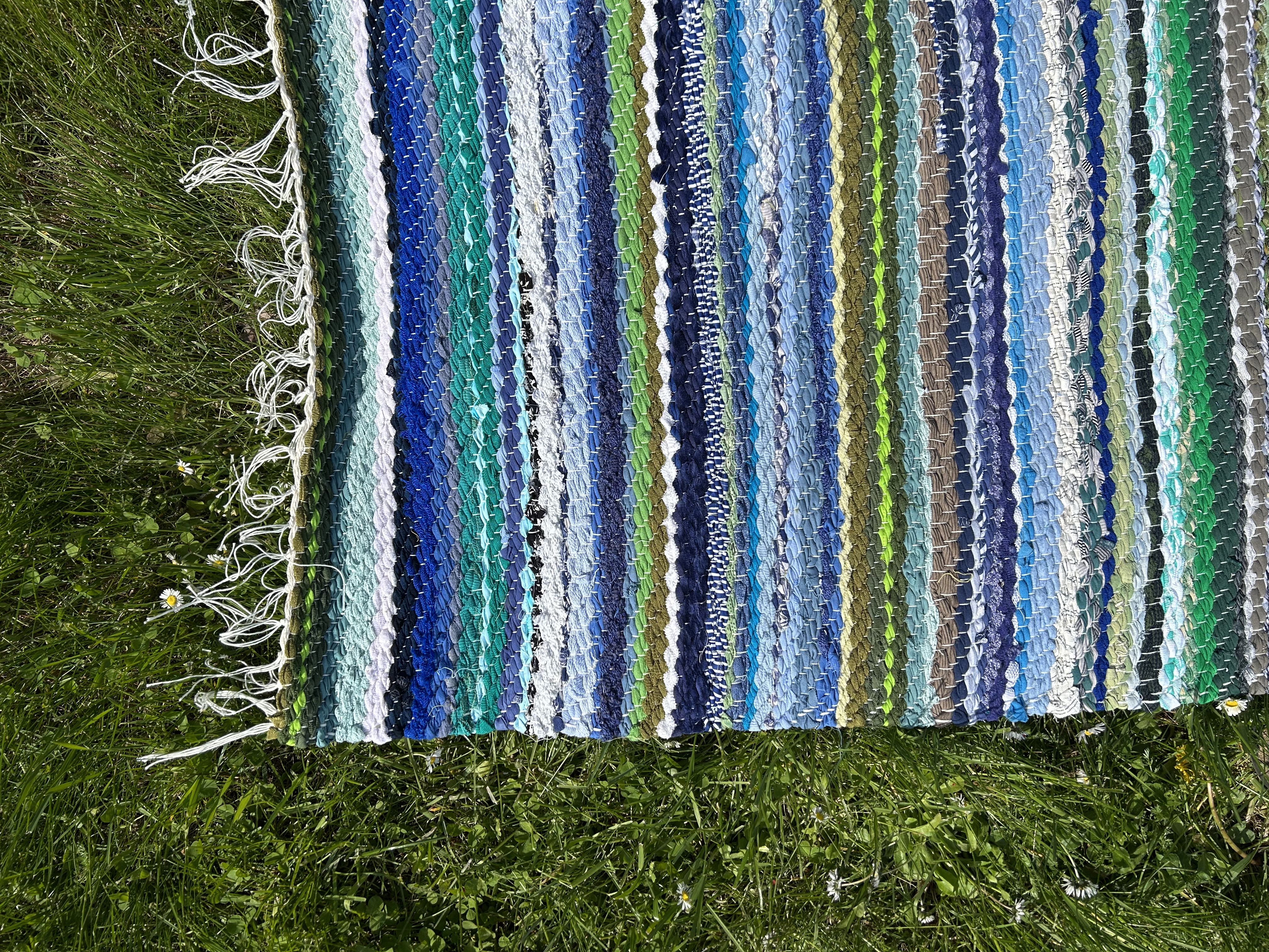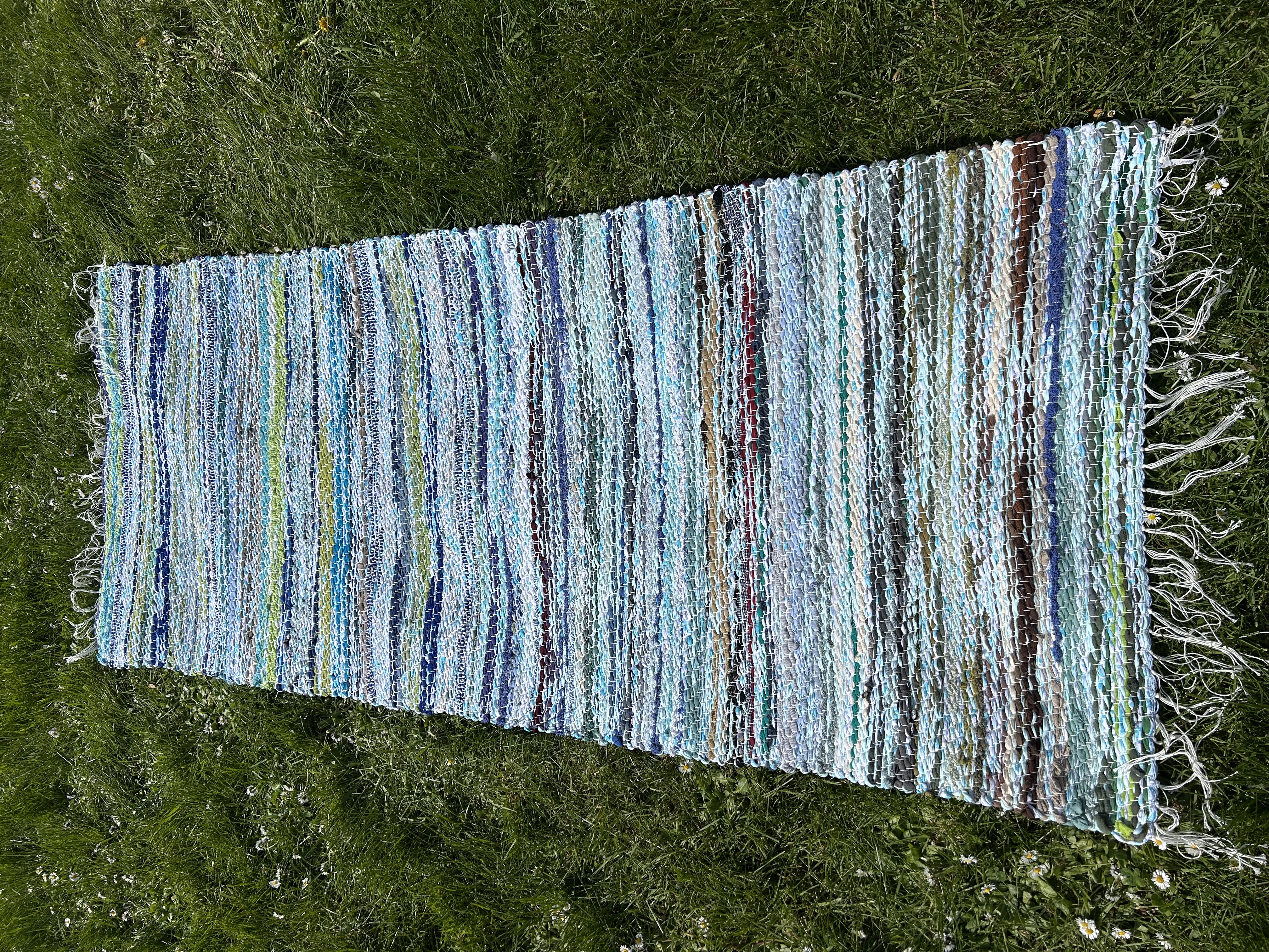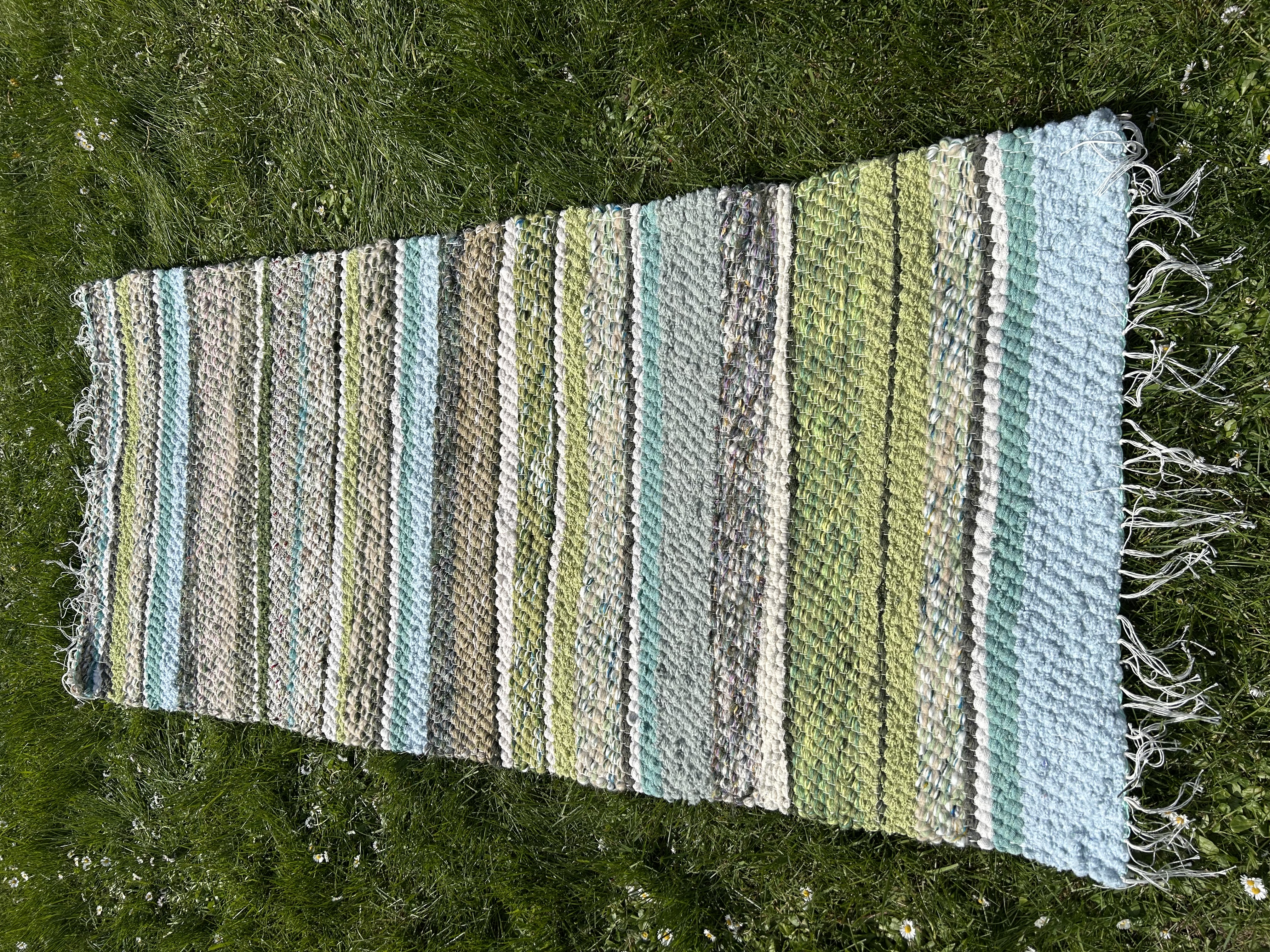 Merevärvides kaltsuvaip, kus segunevad erinevad sinised ja rohekad toonid. Toob tuppa suvise ja värskendava meeleolu.