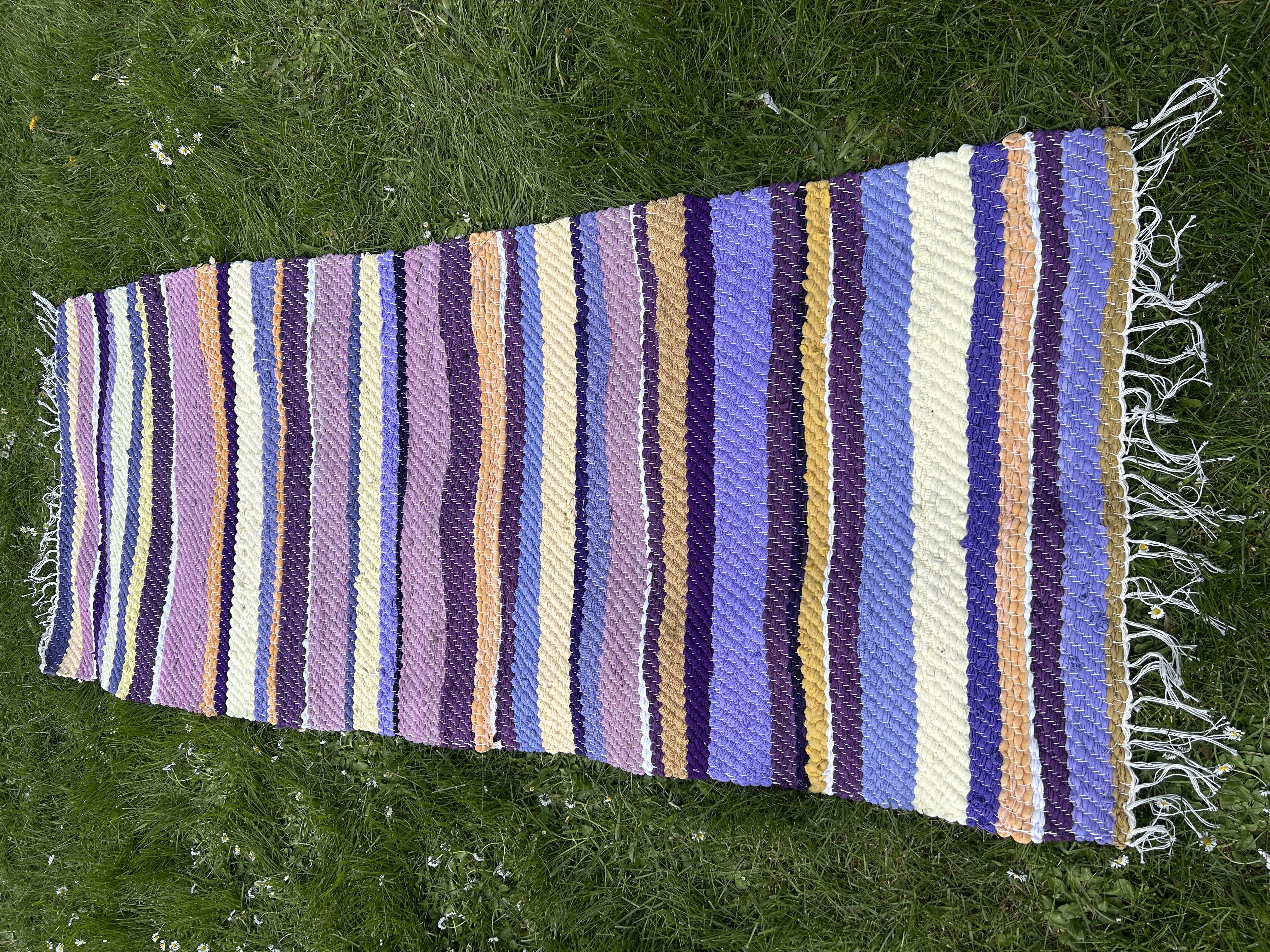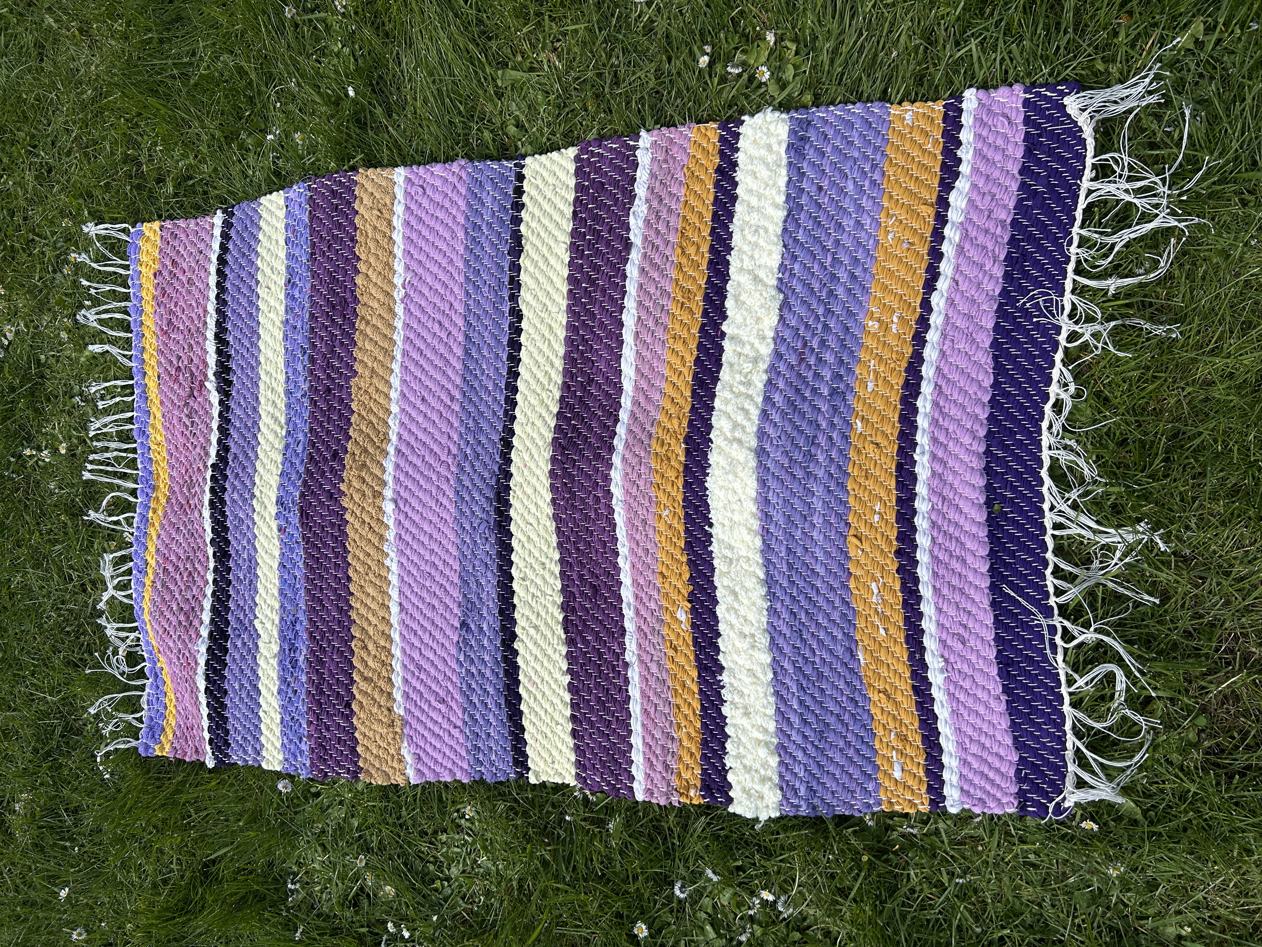 Kvaliteetne ja tihe vaip julgetes värvides: sügav lilla, sinepikollane ja kreemjas valge. Tugev ja iseloomuga põrandakate.